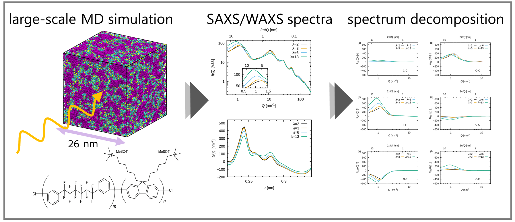 近年、我々が研究対象としてきたのは、QPAF-4と呼ばれるアニオン交換膜です。高分子の側鎖のイオン交換基として塩基性のアンモニウム基を持つため水酸化物イオンなどの陰イオンを輸送できます。 計算機上で行ったX線散乱実験は、実際の実験とよく一致するだけではなく、実験では難しいスペクトルの原子種間のペアへの分割も容易に行えます。 QPAF-4の解析では、含水率の増加に伴いフッ素-フッ素間の相関が他のペアよりも進むことが確認されました。 炭化水素とフッ化炭素の疎水性の違いに起因する興味深いモルフォロジー変化を示していると考えられます。