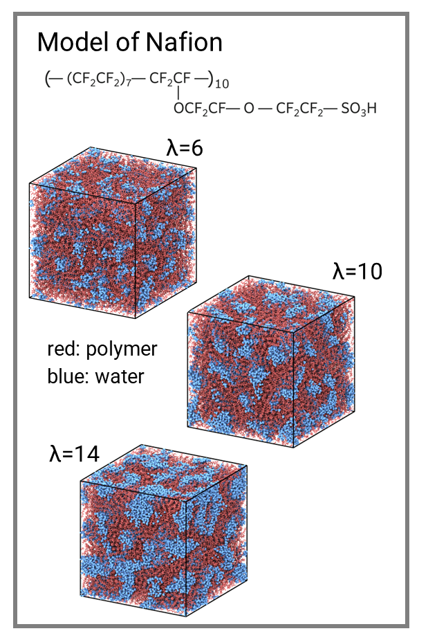 Nafionに代表される燃料電池の高分子電解質膜では、疎水的な主鎖と スルホ基などの親水的な側鎖を持つ高分子と水が混じり合うことで、 3-5 nm程度のスケールで相分離しています(図1参照)。 また、電極触媒層に用いられる多孔質カーボンも不均一系の一例で、 数nmの細孔が材料に意図的に形成されています。 燃料電池の動作時には、このような不均一な環境で酸素・水素・イオン・水などの輸送が生じています。 このような不均一な物質で生じる輸送機構を解明し、最適な材料設計を提案することは、燃料電池の性能向上にとっても重要な課題です。