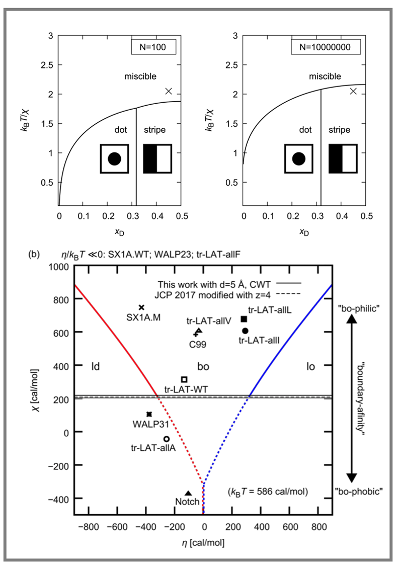 さらに、脂質二重膜の相分離に関するシミュレーションの結果をFlory-Hugginsモデルを用いて統計力学的に解析しました。 この解析を通じて、有限サイズ効果の熱力学的起源を明らかにし、相分離が生ずるのに必要な系のサイズをパラメータに基づき予言することが可能となりました。 この解析は,脂質ラフトの最小サイズを予測することにも利用できます. また、相分離した脂質二重膜上における膜貫通タンパク質の分布を解析した結果、幅広い種類の膜貫通タンパク質が相分離した界面に局在化することが示唆されました。 生体中でも、相分離界面へのタンパク質の集積が機能発現に関わっている可能性があります。