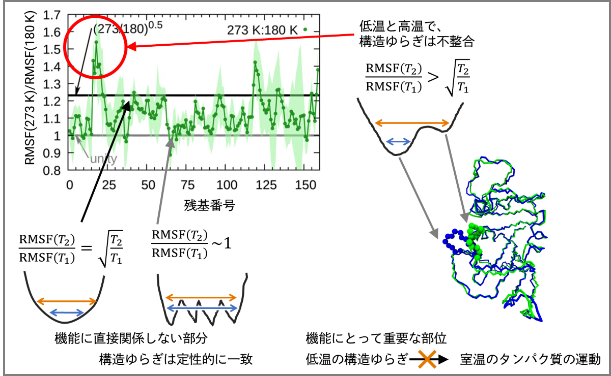 このような背景のもと、X線散乱実験と分子シミュレーションを合わせて分子構造を理解する研究に携わっていました。 タンパク質の結晶構造解析では、平均構造とともに、揺らぎの情報も得られます。 しかしながら X線結晶構造解析は低温で行われることが多く、そこで得られた揺らぎが室温での運動の指標になるのかは、必ずしも自明ではありません。 我々は、ジヒドロ葉酸レダクターゼ(DHFR)と呼ばれるタンパク質の単位結晶を計算機上に再現し、 京コンピュータを利用し低温から室温まで構造と揺らぎの変化を調べました。 その結果、機能部位には非調和な構造揺らぎがあり、 低温と室温では運動に質的な違いのあることが示されました。 つまり、X線結晶構造解析で得られる構造揺らぎから室温のダイナミクスを解釈する際には、慎重な議論が求められることが示唆されます。